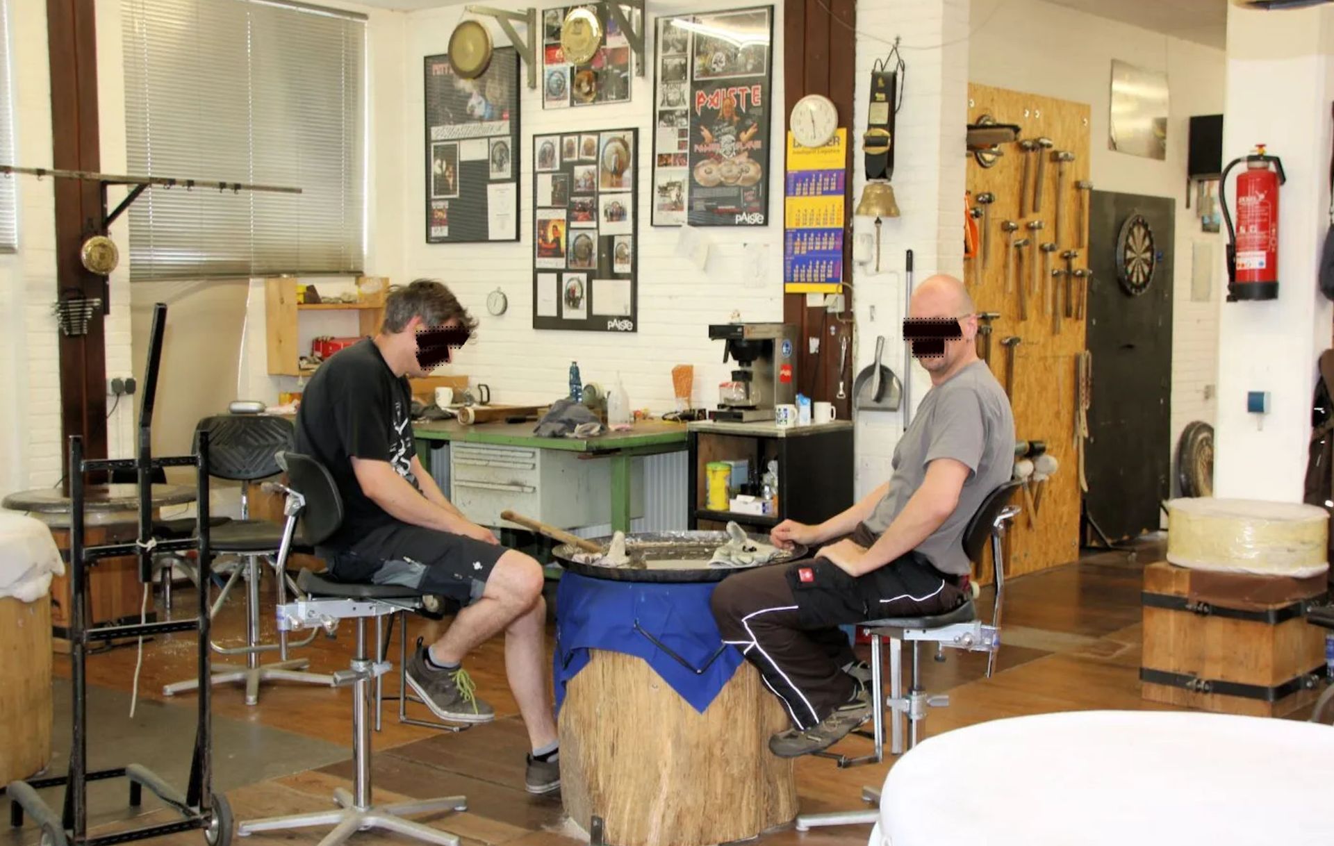 Ich durfte mich im PAISTE-Werk ein wenig umsehen und mir im Herzen der Gongproduktion ein Bild von dem kraftaufwendigen Handwerk machen. Beeindruckend, mit wieviel Aufwand, Körpereinsatz und Sorgfalt die einzelnen Arbeitsschritte getätigt werden. Mit vielerlei gekonnten Hammerschlägen kreieren die Gongbauer fein gestimmte Instrumente. Und leise ist das Fertigen eines Gongs nicht wirklich!