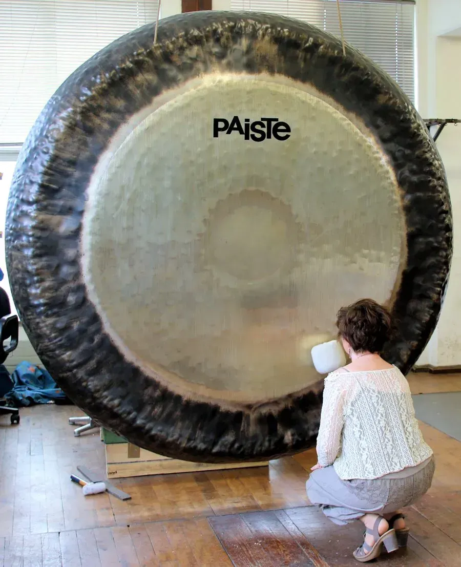Mein Plan war also, den Erdenton als Ergänzung zu meinem bereits vorhandenen PAISTE Symphonic Brilliantgong hinzuzunehmen. Freundlicherweise hängte man mir auch den Earth-Creation-Gong zum Bespielen auf, da mich der obertonreiche Sound dieses Gongs ebenfalls interessierte. Der Creation ging beim Spielen schnell eigene Wege – majestätisch, kraftvoll aber mir zu obertonlastig. Seine herrlich planetar anmutende Oberfläche fand ich inspirierend.