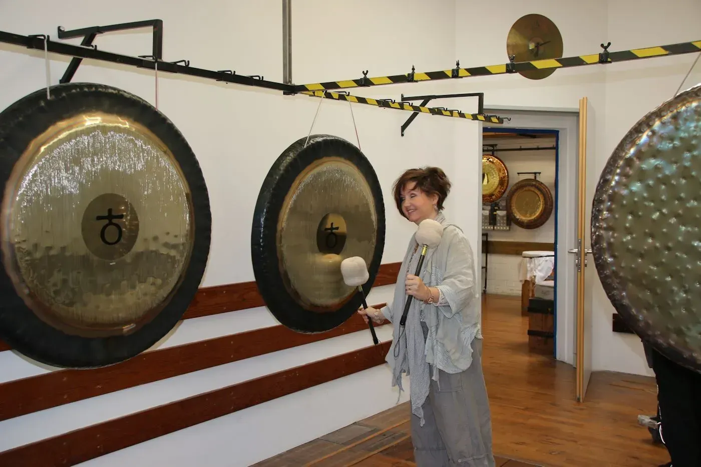 Ich hatte den Wunsch, den Gongbauer kennen lernen zu dürfen, der meinen wundervollen Gong 38“ EARTH C2#/Cis-68,05 Hz ins Leben rief, ihn mit viel Sorgfalt, viel Hitze, viel Anstrengung und Schweiß trieb und hämmerte, bis er zuletzt für mich perfekt klingen sollte. Zum Glück befand er sich am Tag meines Besuches in der Produktion und kam zu uns in den Showroom. Ich musste ihn umarmen, links und rechts auf die Wange küssen und ein Foto von uns machen! Danke Marco! Auch in meinem Yoga- und Klangraum klingt dein Gong wahrlich meisterhaft!