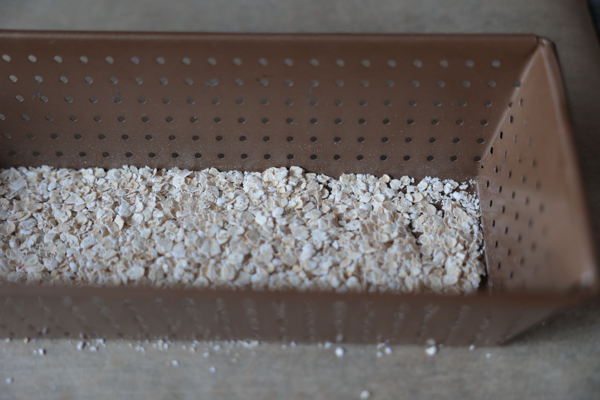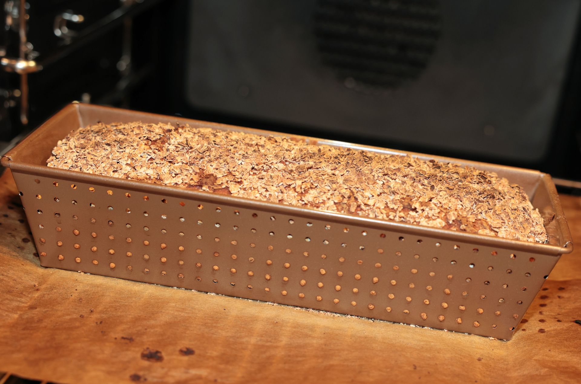 Eine normale Kastenform muss vorher eingeölt und Boden und Seiten mit Haferflocken bestreuen werden, damit das Brot nicht anhaftet. Das z.B. brauche ich nicht mit meiner löchrigen Form.