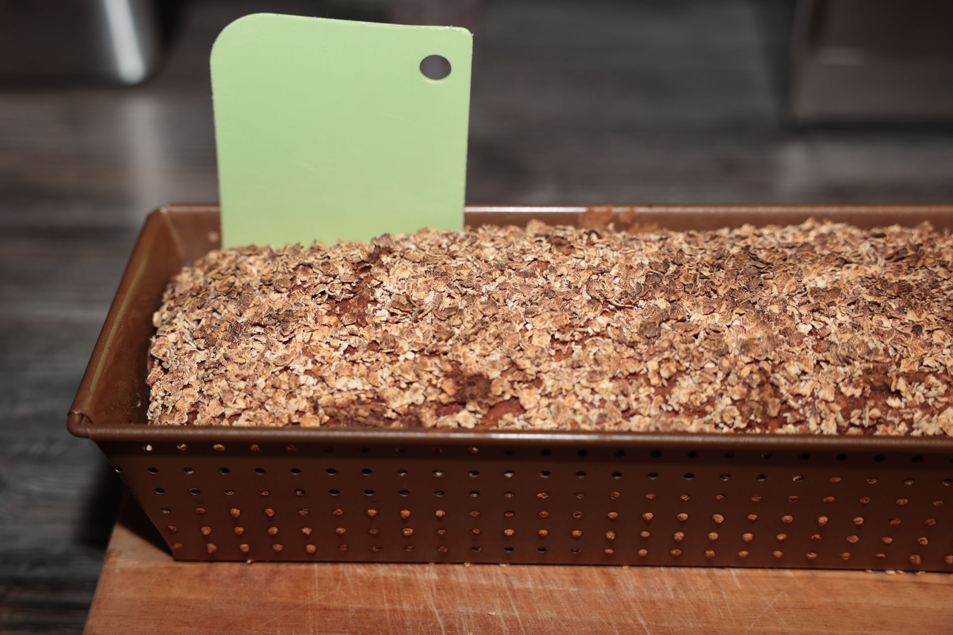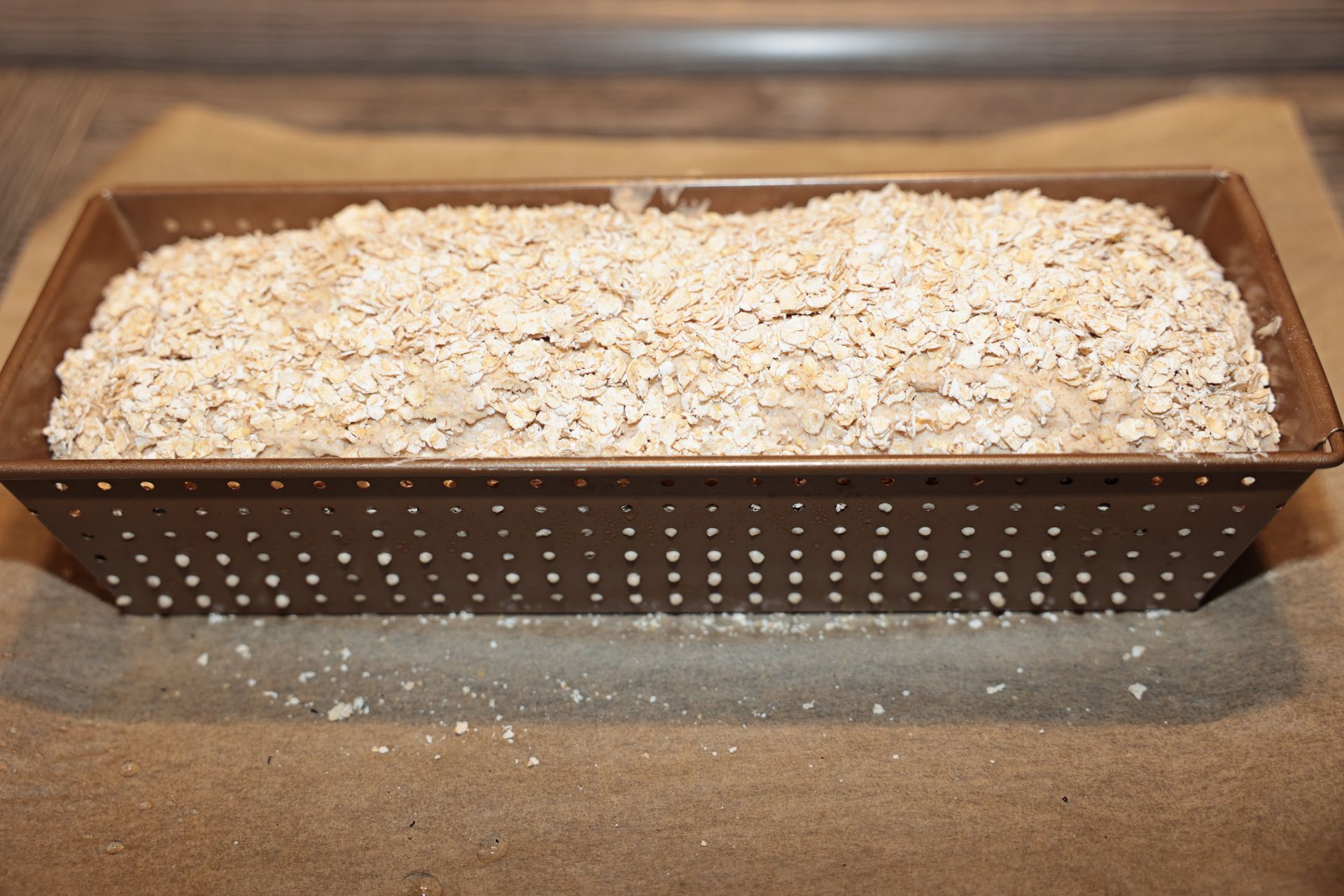 Ich bestreue den löchrigen Boden meiner Backform mit Haferflocken und gebe den Teig hinein, streiche ihn an der Oberfläche mit wenig Wasser glatt und bestreue diese ebenfalls mit Haferflocken, damit die Kruste nicht zu hart wird. Die Form stelle ich vorher auf Backpapier. So kommt sie dann auch in den Ofen zum Gären und später zum Backen.