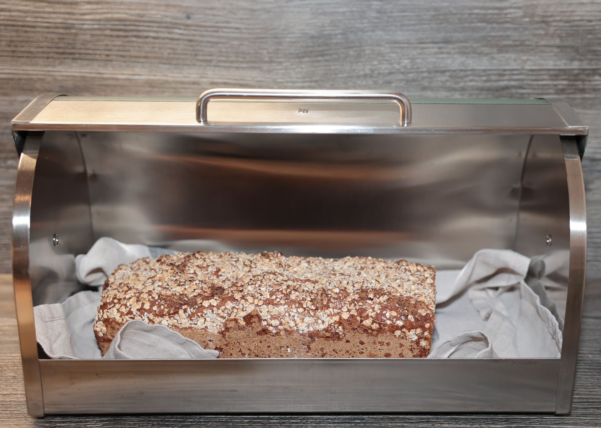 Bevor der Kasten verschlossen wird, sollte der Laib komplett abgekühlt sein. Außerdem empfiehlt es sich, den Kastenboden mit einem Leinen- oder Bauwolltuch auszulegen, welches überschüssige Feuchtigkeit bindet. Für jedes neue Brot sollte das Tuch ausgetauscht werden.