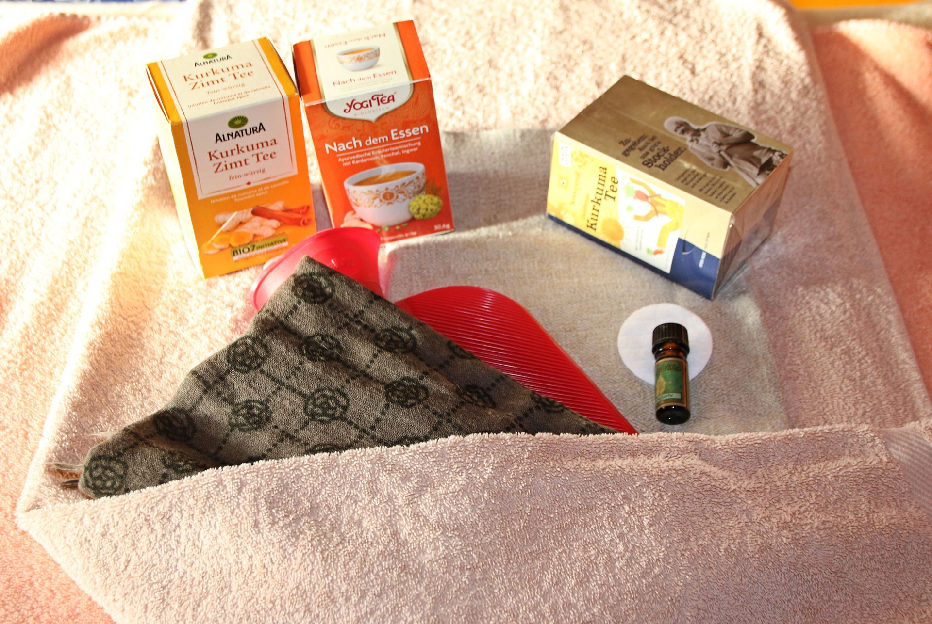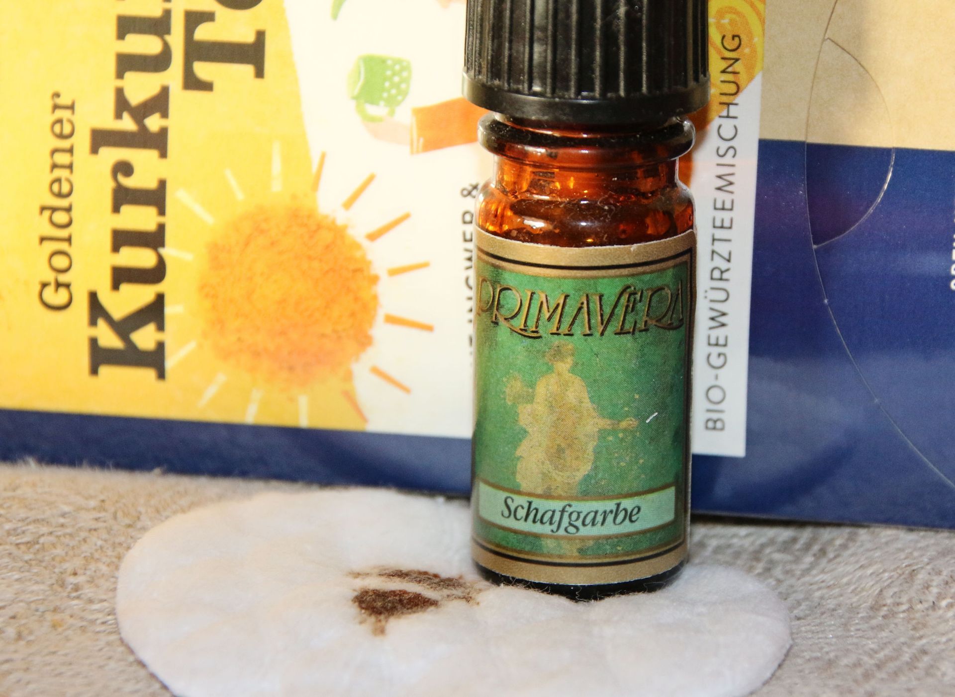 1 EL Schafgarbenkraut, welches z.B. in Apotheken oder Bioläden erhältlich ist, in einem halben Liter dampfenden Wassers geben und zugedeckt 5 Minuten ziehen lassen. In der Zeit eine Wärmflasche vorbereiten.
